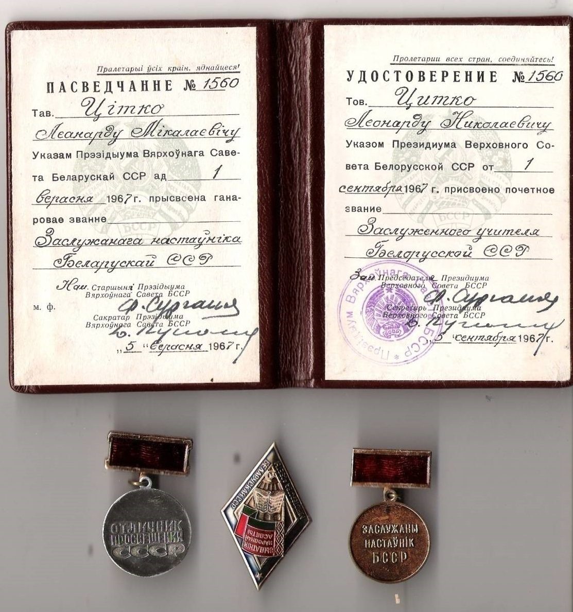 Присвоено звание «Заслуженный учитель БССР» (1967).